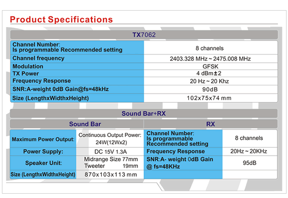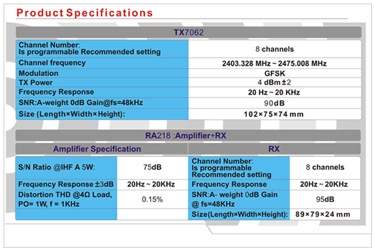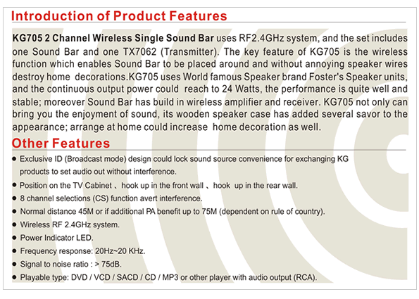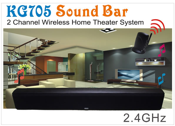 KG Wireless Home Theater Systems uses RF2.4GHz system. The Key feature Of KG products is it can be integrated with any brands of speakers. Design of KG wireless systems benefits the speakers that can be placed around the room to create 3D surround sound effect without position limitation and house can be decorated without annoying wires.。